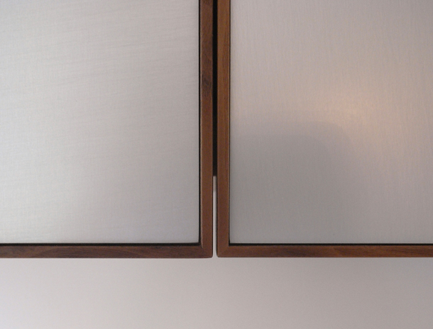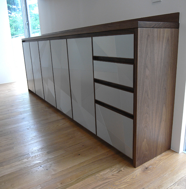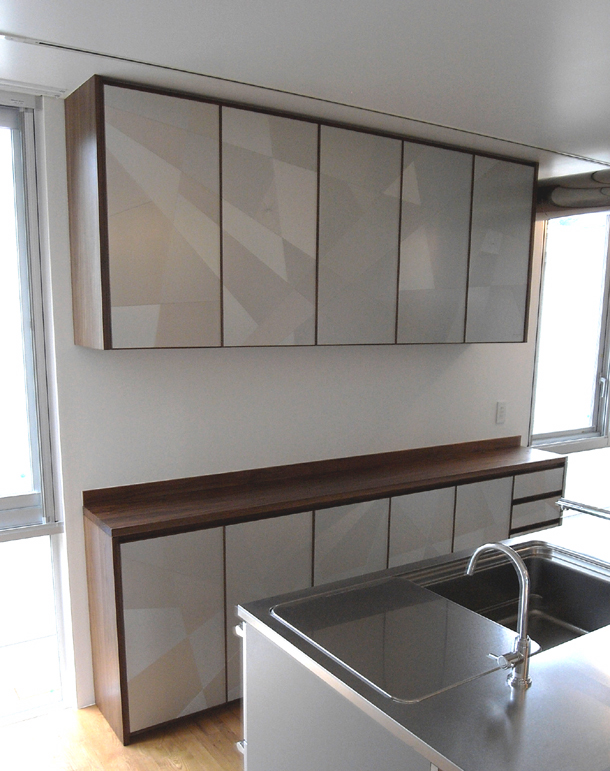 見ての通り、家具の扉にアルミの作品を取り付けています。