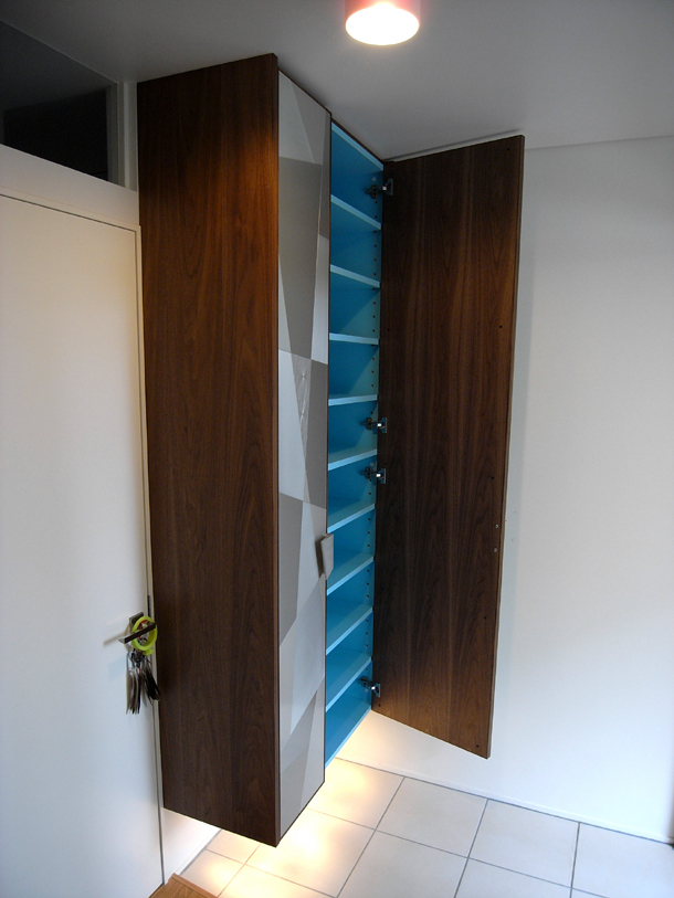 お宅の形状から、下駄箱は、玄関扉を開けたらすぐに目に飛び込んできます。